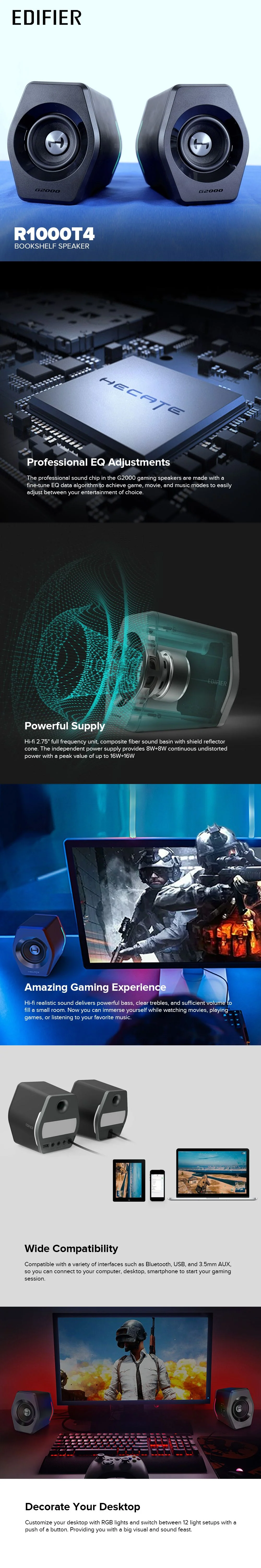 - Professional EQ Adjustments: The professional sound chip in the G2000 gaming speakers are made with a fine-tune EQ data algorithm to achieve game, movie, and music modes to easily adjust between your entertainment of choice.