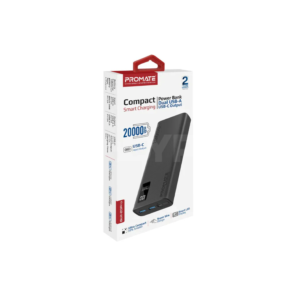 Promate Bolt-20Pro 20000mAh Compact Smart Charging Power Bank with Dual USB-A & USB-C Output Black